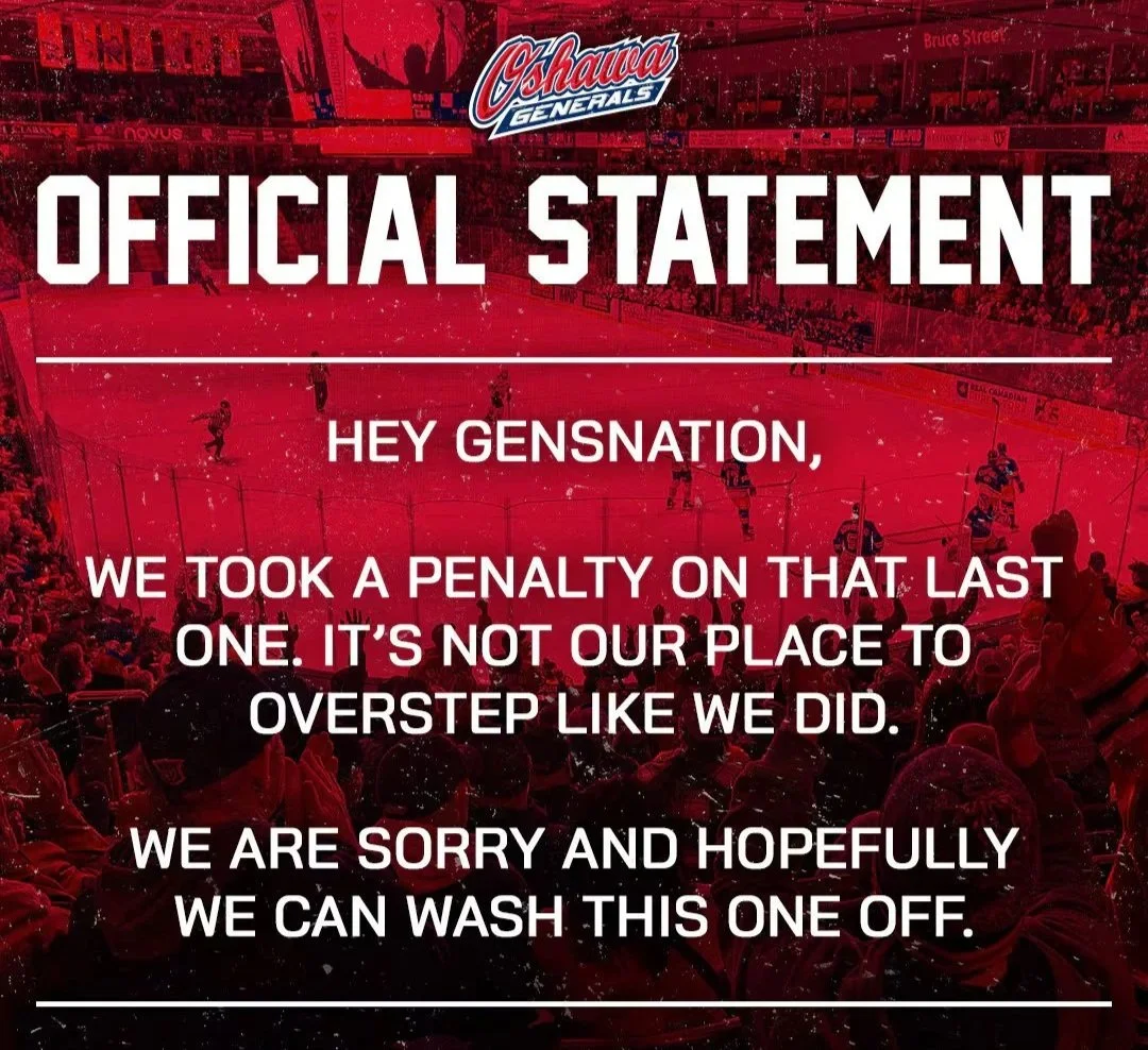 On Thursday, the Generals posted an apology across social media platforms, saying they had “taken a penalty” and acknowledging it was not their place to overstep. The team added that they were sorry and hoped they could “wash this one off,” leaning into the hockey metaphor while attempting to cool the situation.