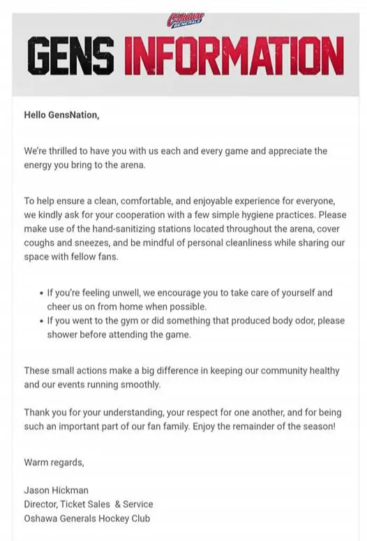 In an interview with DurhamRegion.com, Hickman said the email was prompted by an increase in complaints from fans about strong odours inside the arena over the past month. He described hearing grievances about people smelling like “cat pee,” bad breath, and other unpleasant scents. According to him, the complaints had become frequent enough that the organization felt it needed to address the issue broadly.